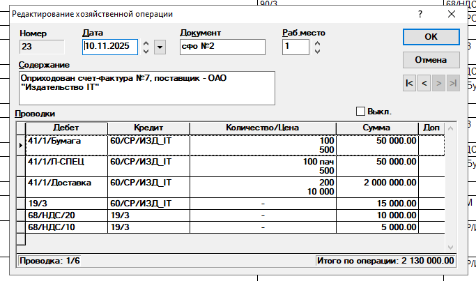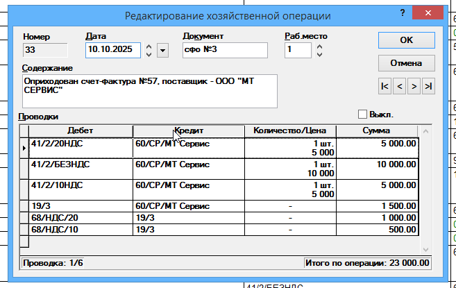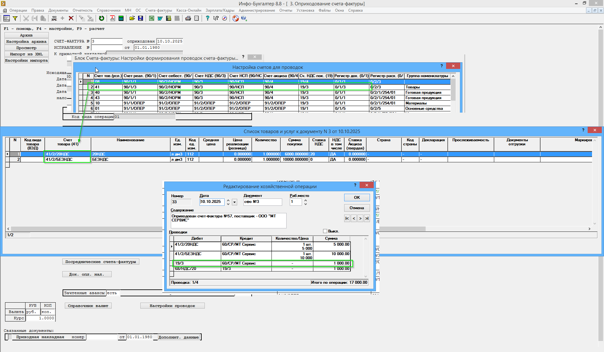 Выбирая в товарной строке счета 41/2/...., Вы в любом случае получите в хозяйственной операции проводку с 19/3 счётом, общую по всему оприходования СФ, где счёт.