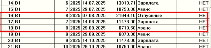 Затем выдан аванс августа. По итогу начисления зарплаты августа "начислено-выплачено" = ноль. Выдачи зарплаты в августе нет. Но вычет снова есть.
