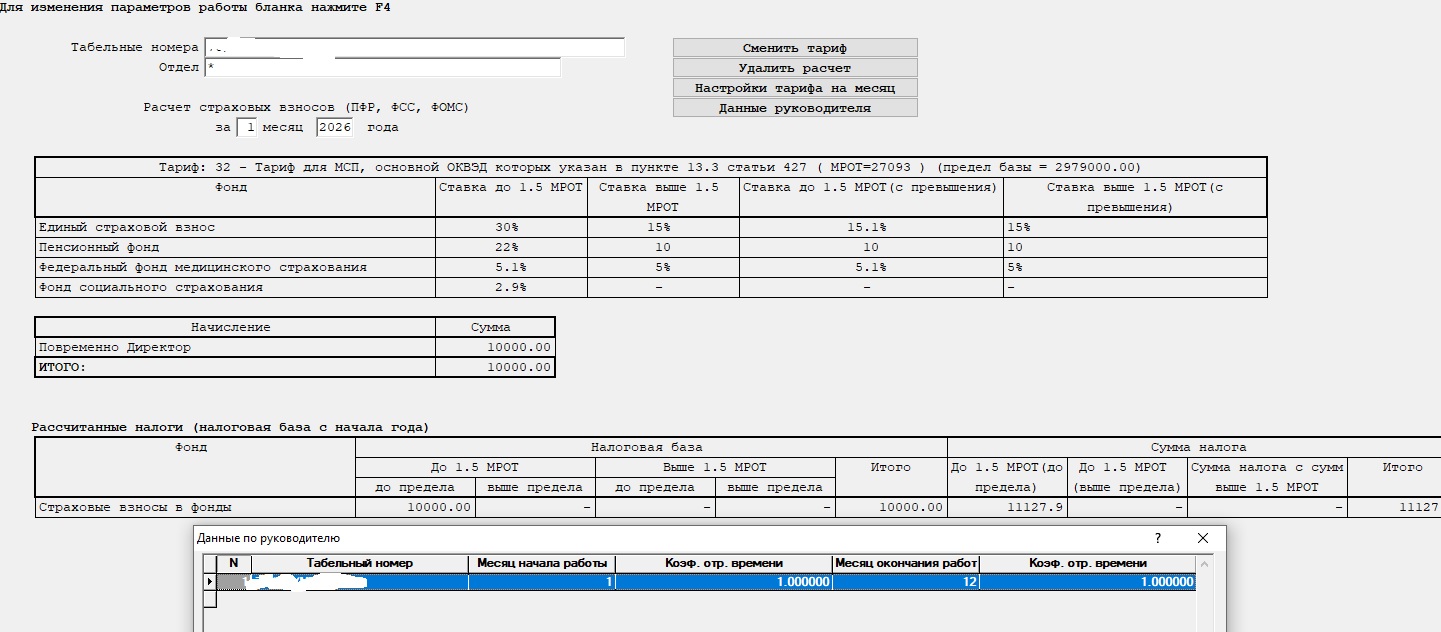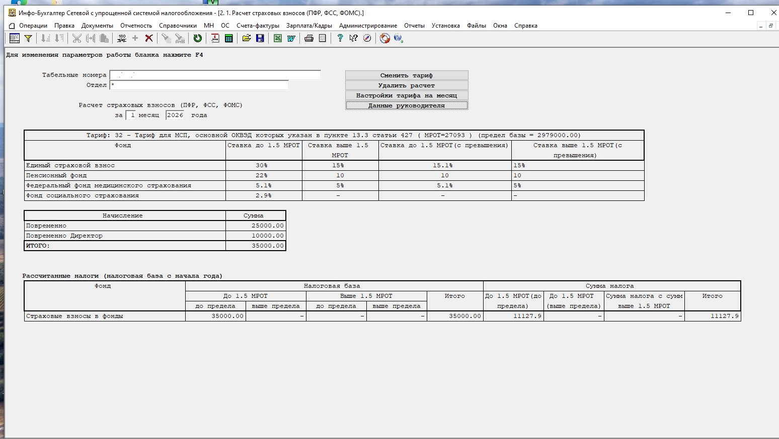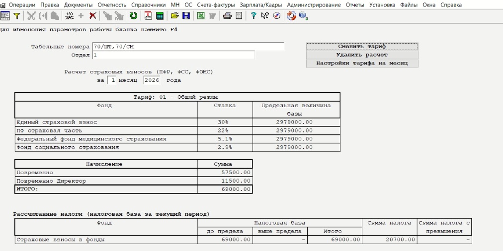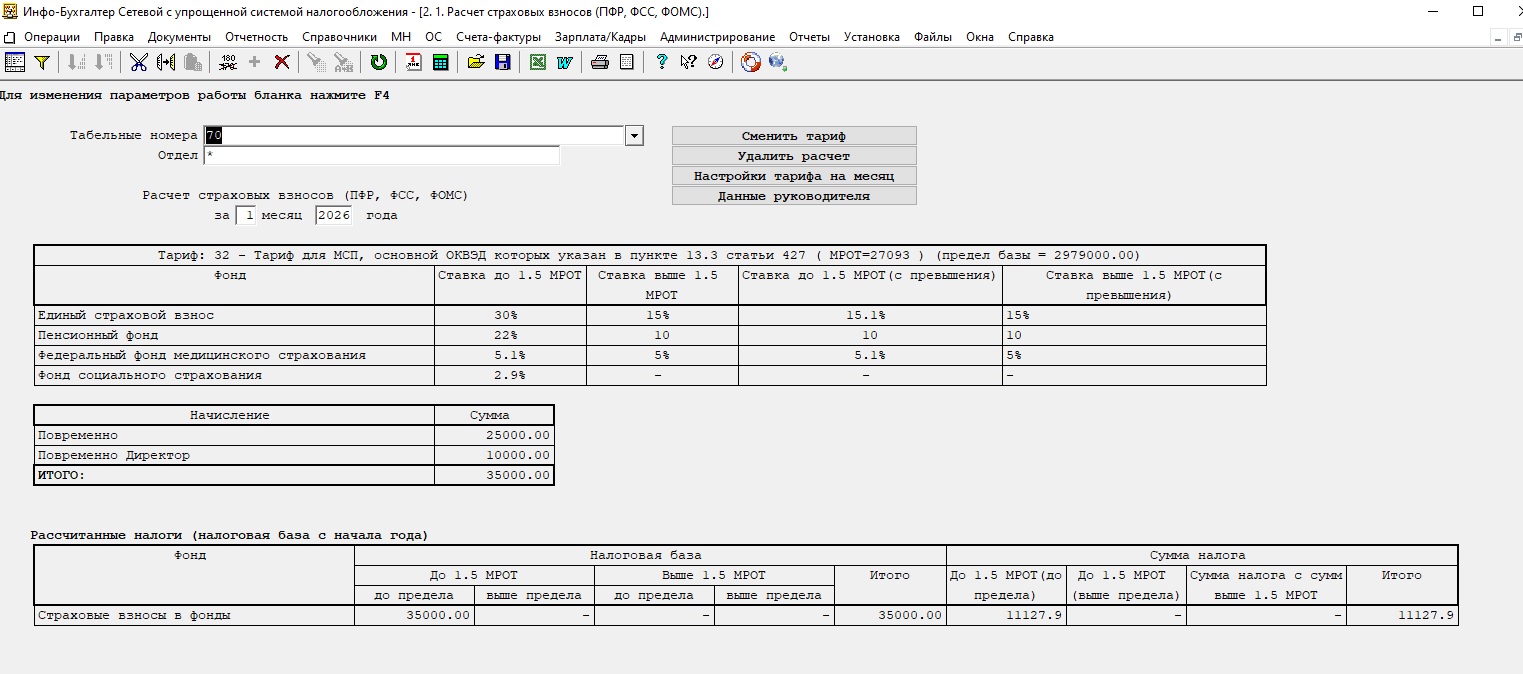 Добавила расчет зарплаты по второму человеку -25000 руб. Т.е. в базе зарплата рассчитана по 2м работникам ( один из них –директор). Расчет взносов делаю только по директору