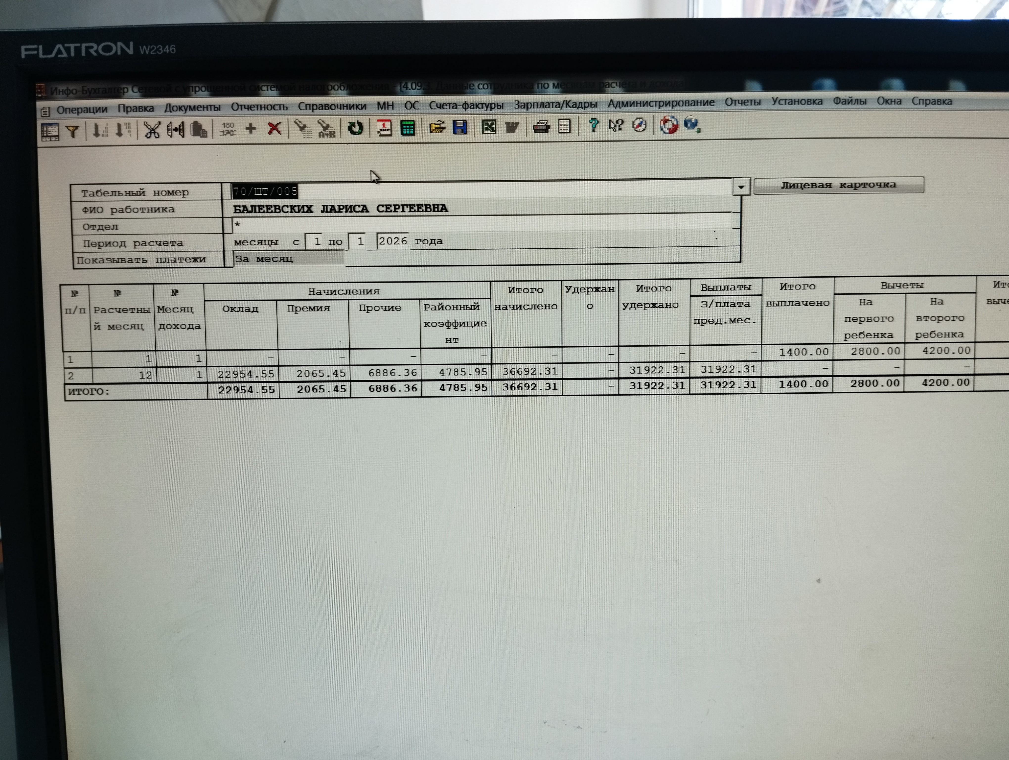 Бланк Лицевая карточка за январь 2026 года заполняет в первой строке только вычеты на детей, а во второй строке начисления за декабрь 2025 года. Зарплата за январь 2026 года рассчитана.