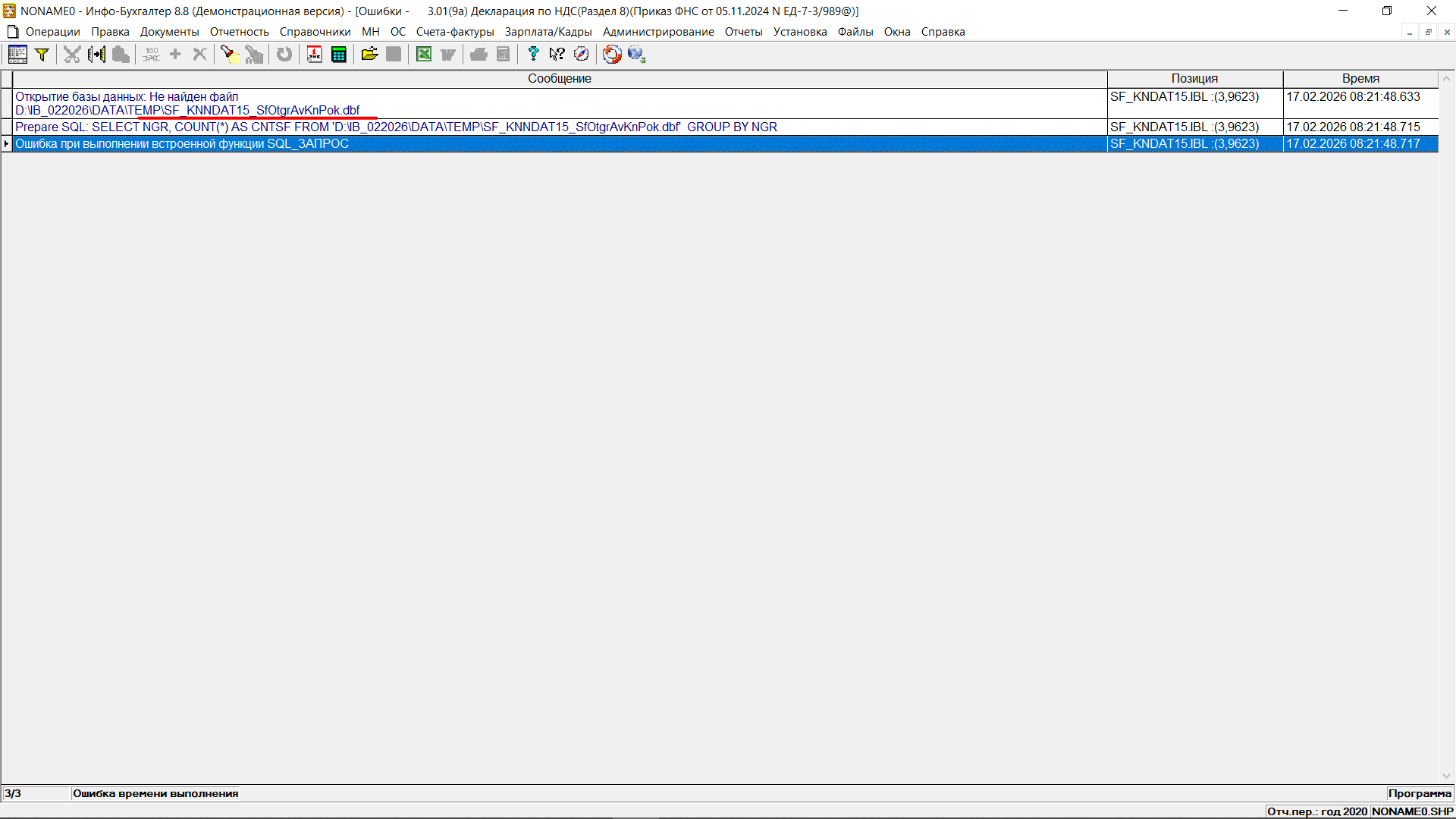 Декларация по НДС Раздел 8 (Книга Покупок) 18.02.2026 00:57 # Лидия Корноухова пользователь Регистрация: 27.05.2013 При открытии вылетает ошибка. Программа не может найти файл SF_KNDAT15_ФайлСфОтгрАвКнПок.dbf в папке Temp Как он туда должен попасть? С уважением, Корноухова Л.Н. Вложения Ошибка Раздела 8 КнПок.png53.49 КБ 1 просмотр