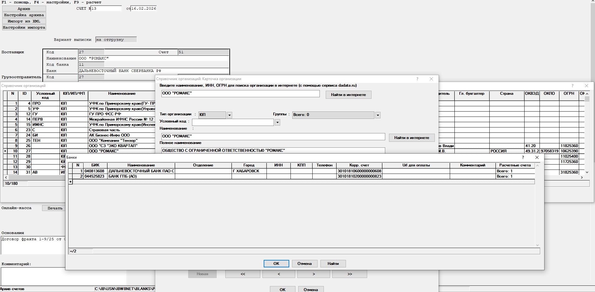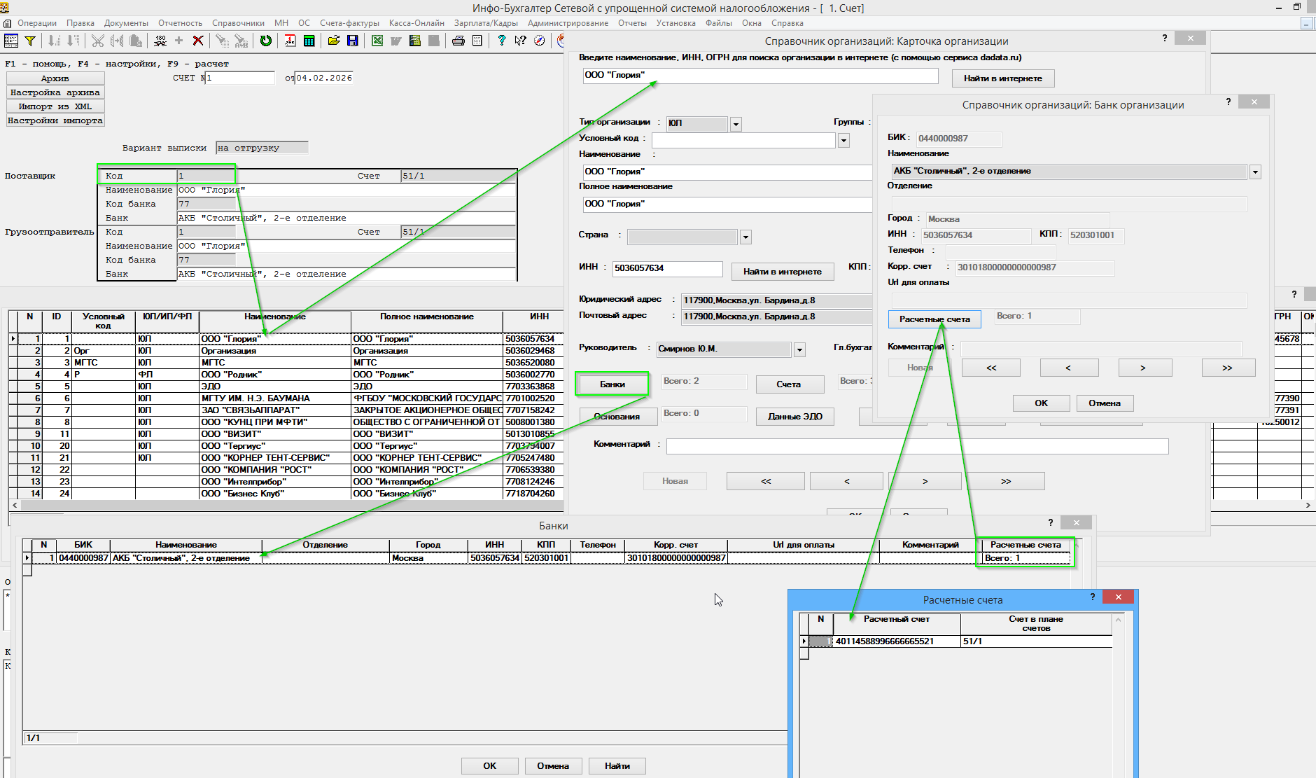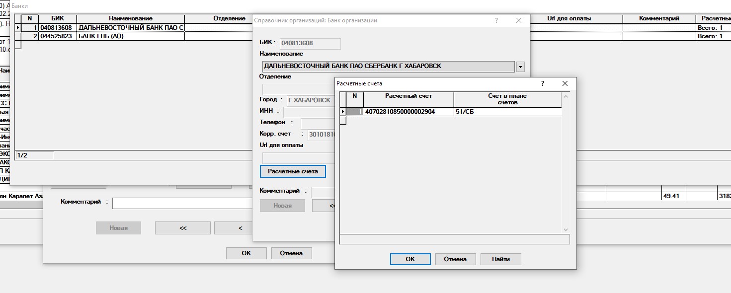 Справочник организаций -> Выбор банка -> Ввод расчётного счёта.