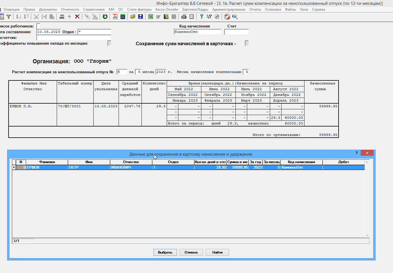 Сетевая ИБ-8. Расчет компенсации при увольнении. Все рассчитывает классно. Добавляем в карточку, а в карточке - ничего от слова совсем. И межрасчет не формируется. Что не так делаем?