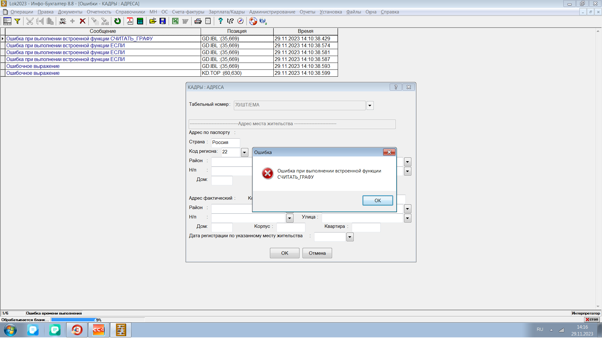 Кадры - Т-2. Личная карточка (атоматическое заполнение) 29.11.2023 10:26 # Зибарева Светлана пользователь Регистрация: 11.08.2010 Версия ИБ 8.894 "23.11.01 ПРОФ" локальная. При заполнении карточки в разделе 15 - Адреса - улица - выходит ошибка. Вложения Личная карточка_Адрес.png101.85 КБ 75 просмотров