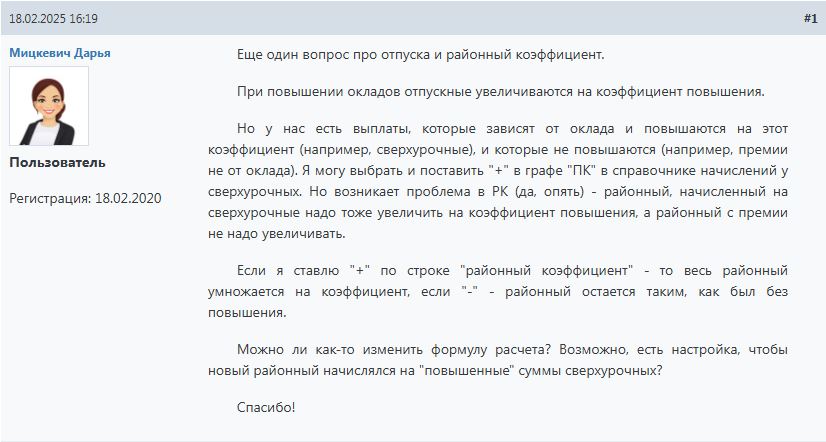 Ну и ранее уже оставляла просьбу сделать расчет отпускных при повышении окладов с разбивкой по суммам, корректируемым и некорректируемым на коэффициент повышения (районный коэффициент чтобы считался отдельно) - тут https://www.ib.ru/forums/topics/13562 второе сообщение. Подскажите, пожалуйста - есть где-то уже такая настройка? Я вроде пока не вижу, обновления все стоят.