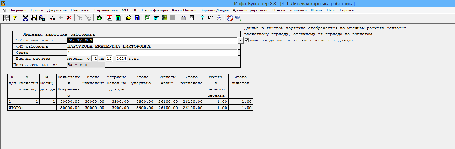 Бланк Лицевая карточка за январь 2026 года заполняет в первой строке только вычеты на детей, а во второй строке начисления за декабрь 2025 года. Зарплата за январь 2026 года рассчитана.