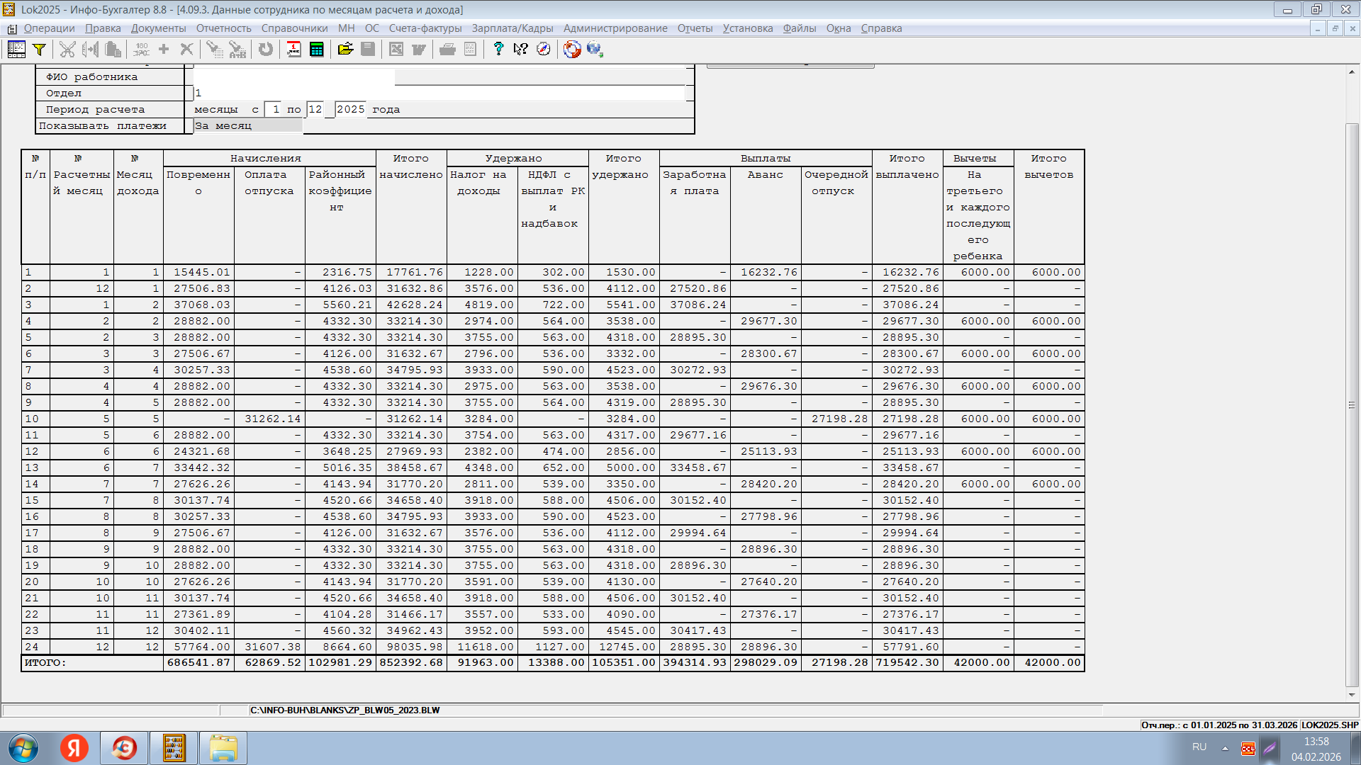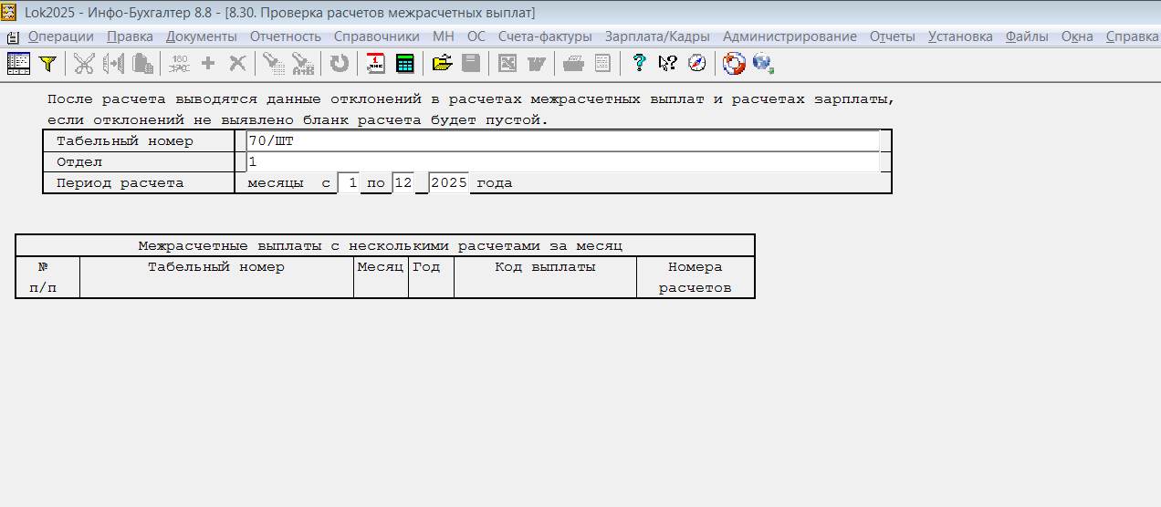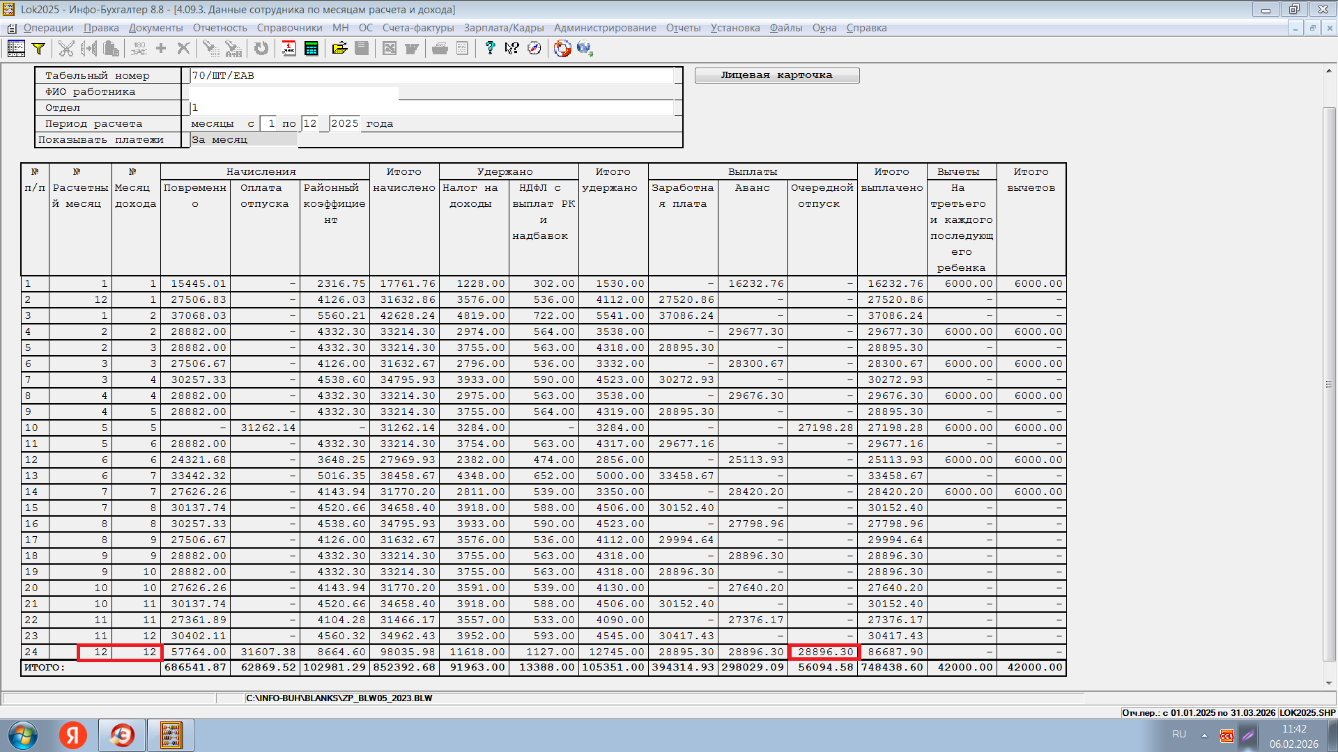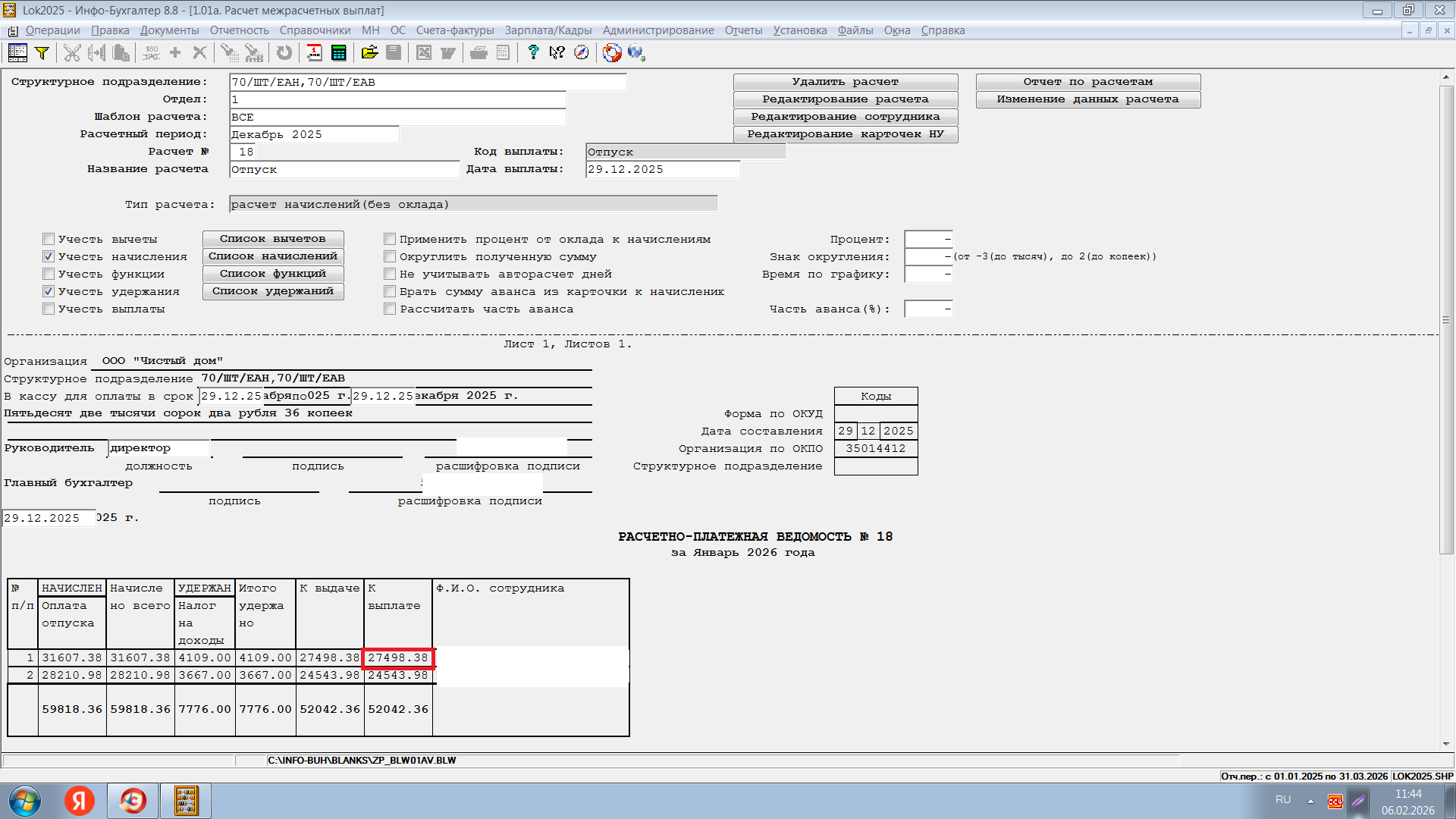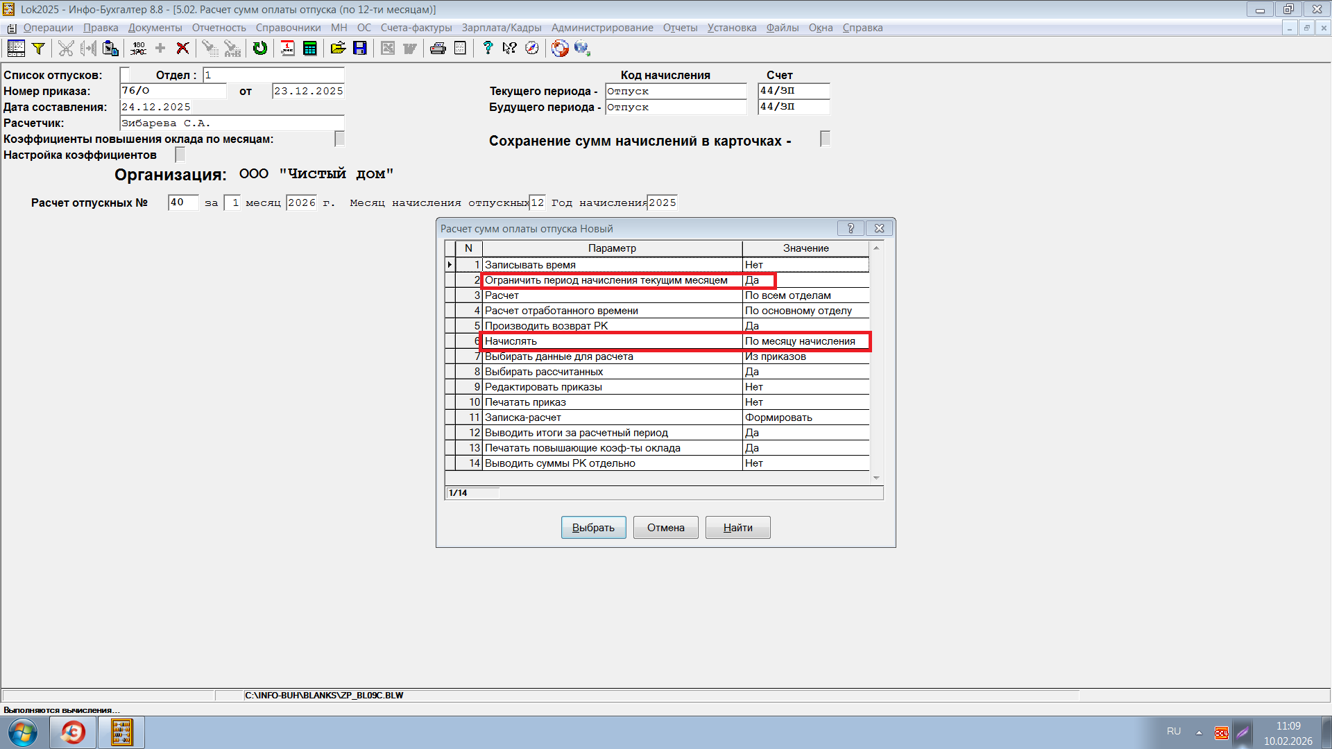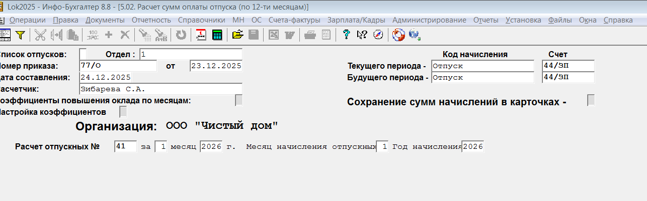Поменяла расчет отпуска 5.02 - расчет за 1 месяц 2026, месяц начисления 12 месяц 2025.