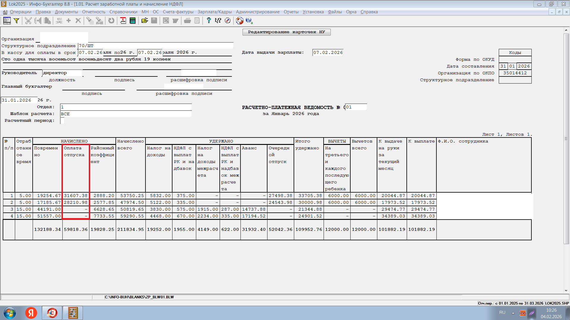 Помогите разобраться, отпуск отражается и в декабре 2025 года, и в январе 2026 года.