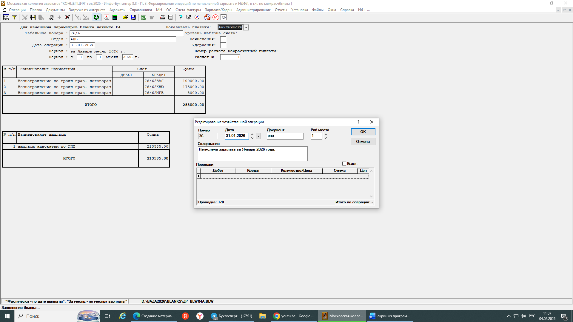 Блок "Адвокаты" используем первый год. Не формируется проводка по начислению зарплаты именно адвокатам – ни в период межрасчетов, ни в конце месяца – удержание НДФЛ формируется. При этом расчет производится верно. Операция "Закрытие периода" не выполняется - отсутствует бланк "Адвбух.blw". Обновление автоматическое в программе настроено, но есть ли обновление этого блока "Адвокаты" - не понимаю.
