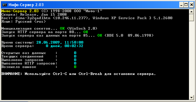 Контроль работы сервера осуществляется с помощью консоли сервера: